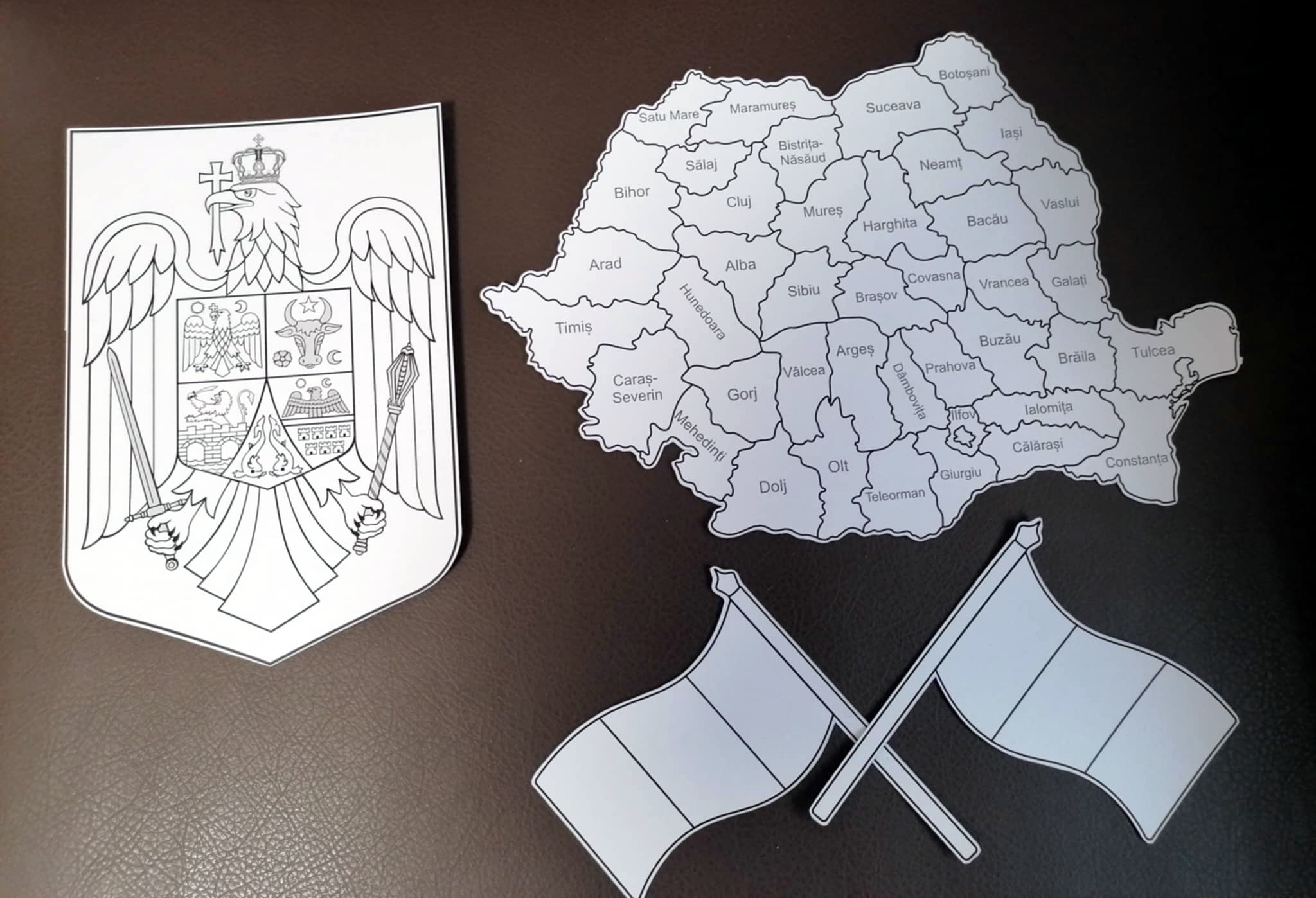 SIMBOLURILE ȘI HARTA ROMÂNIEI - SILUETE DIN CARTON PENTRU COLORAT