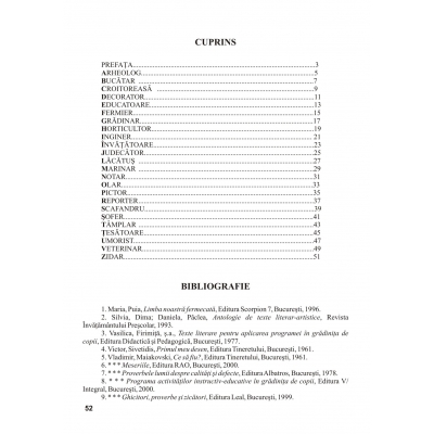 Lucrarea „ABC-ul meseriilor”, este un auxiliar didactic care sprijină activitatea instructiv-educativă în grădiniţă. Educatoarele vor găsi în această carte o serie de sarcini, adecvate vârstei şi preocupărilor copiilor preşcolari, prin care aceştia fac cunoştinţă cu diferite profesii sau îşi completează cunoştinţele despre ele şi, totodată, abordează aspecte ale lumii înconjurătoare dintr-o perspectivă interdisciplinară. Acestea au fost selectate în vederea utilizării lor în cadrul procesului de cunoaştere şi investigare, iniţiat şi desfăşurat de educatoare, împreună cu preşcolarii, în special cu prilejul activităţilor de Educarea limbajului, Cunoaşterea mediului şi Educaţie pentru societate. Imaginile sugestive şi macheta interesantă a lucrării vor ajuta şi stimula copiii în procesul de cunoaştere în care sunt indirect implicaţi. FORMAT: 21 x 29,7 cm, 52 pag.