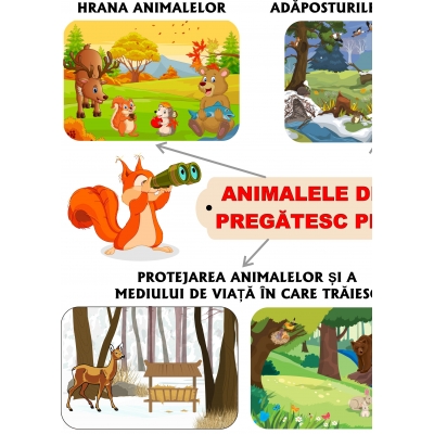 Materialele din această mapă vin în sprijinul cadrelor didactice, dar și al copiilor, oferindu-le posibilitatea de a explora și înțelege diferite aspecte din viața animalelor pădurii (cu ce se hrănesc în diferite anotimpuri, unde se adăpostesc iarna, cum se pot identifica animalele după urmele lor, cum protejează oamenii animalele sălbatice și mediul lor de viață și ce animale sunt pe cale de dispariție și de ce).