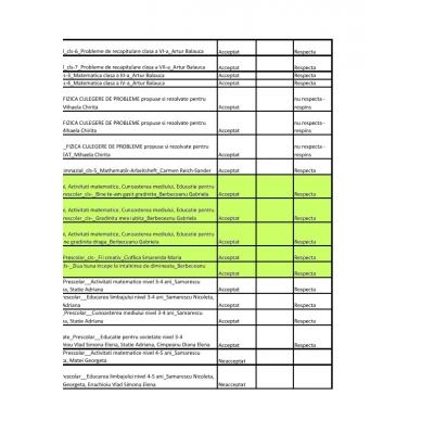 Lucrările prezentate spre avizare de către Editura Tehno-Art și avizate în sesiunea 09.10.2017-05.01.2018 se găsesc la pagina 68 a documentului CNEE RAPORTARE FINALA AUXILIARE 2017 respectiv în OM nr.3022 din 08.01.2018 pag 78, nr.1181-1185 din care este prezentată doar pagina mai sus menționată. Pentru situația completă a avizărilor vizitați site-ul www.rocnee.eu, sau mai jos la secțiunea Descarcă.