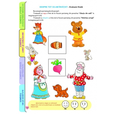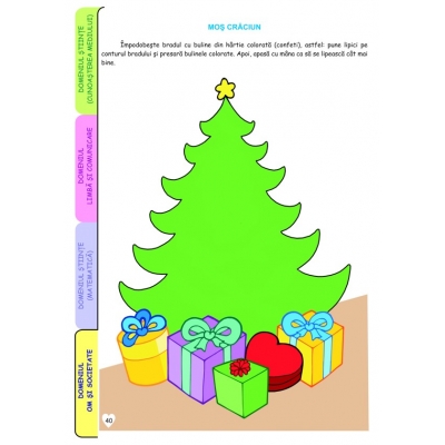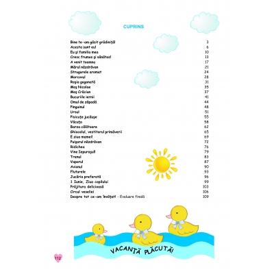 Aprobat OMEC Nr.6250 din 21.12.2020. 4 CAIETE INTR-UNUL SINGUR. Face parte dintr-un grup de 3 caiete care au fost concepute de cadre didactice cu experienţă, pentru fiecare an de studiu: 3-4 ani; 4-5 ani, 5-6 ani şi în concordanţă cu cerinţele curriculumului preşccolar. Fiecare caiet conţine mai multe subteme, iar fiecare subtemă are 3 sau 4 fişe pentru domeniile experienţiale: Ştiinţă – Cunoaşterea mediului; Limbă şi comunicare; Ştiinţă – Matematică; Om şi societate – Activităţi practice/Educaţie pentru societate. Aceste subteme pot fi utilizate, la alegerea educatoarei, în cadrul celor şase teme anuale de studiu. Sarcinile de lucru sunt adaptate vârstei, iar ilustraţiile sunt vesele şi atractive. Caietele conţin şi fişe de evaluare (iniţială, sumativă şi finală) pentru fiecare domeniu menţionat mai sus, copilul având şi posibilitatea de autoevaluare. Credem că acest proiect editorial este unul deosebit, având avantajul că un singur caiet acoperă cele mai importante domenii experenţiale dintr-un an de studiu. Caietele sunt utile atât cadrelelor didactice, cât şi părinţilor, în demersul lor comun: educaţia copiilor de vârstă preşcolară. Format 21 x 29 cm (A4), 112 pag. color.
