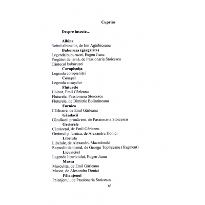 Culegerea conţine mai multe texte literare scrise de autori pasionaţi de lumea vieţuitoarelor. Aceştia surprind comportamentul lor, le descriu înfăţişarea, prezintă mediul de viaţă în care trăiesc şi uneori rolul lor în viaţa oamenilor. Această culegere este destinată cadrelor didactice din învăţământul preşcolar şi şcolar, dar şi părinţilor care doresc să contribuie la îmbogăţirea cunoştinţelor copiilor despre insecte şi alte vieţuitoare mici din mediul înconjurător. FORMAT: 17 x 25 cm, 64 pag.