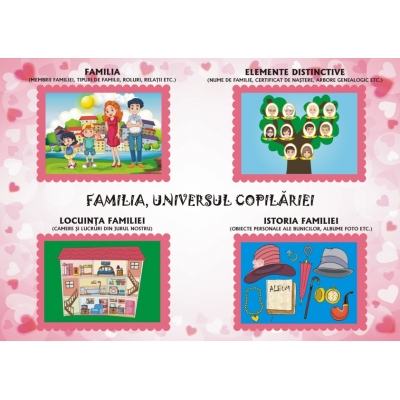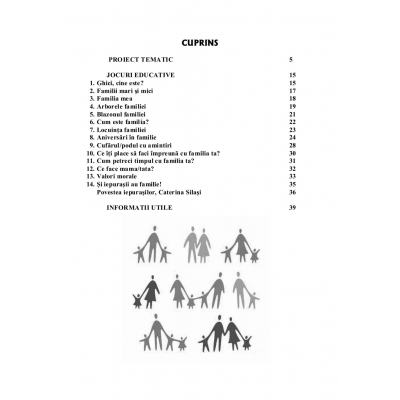 Având în vedere faptul că în 15 mai este Ziua Internaţională al Familiei, autoarele au venit cu câteva idei şi sugestii pentru derularea unor proiecte individuale, precum şi a unor diverse tipuri de activităţi, cu copiii şi cu familiile lor, cu o tematică care vizează acest eveniment. În cadrul jocurilor didactice propuse, pe lângă metodele obişnuite, au fost folosite metode activ-participative pentru dezvoltarea gândirii critice şi de învăţare prin cooperare: ghicitorile; categorizarea; ciorchinele; floarea de lotus; blazonul; ştiu, vreau să ştiu, am învăţat; copacul ideilor.