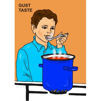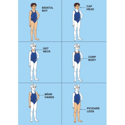 Mapa conţine: 2 planşe-suport (A3, cu fată şi cu băiat), câte 6 jetoane cu părţile componente pentru fiecare planşă; 8 jetoane (A5) cu 4 portrete de fete şi 4 de băieţi; 12 jetoane (A5) cu diferite acţiuni care fac trimitere la cele 5 simţuri, având pe verso reprezentate organele de simţ adecvate şi denumirea în ENGLEZĂ şi ROMÂNĂ; 6 jetoane (A5) cu chipuri şi expresii şi motivul declanşării acestora; 6 medalioane cu simboluri pentru expresiile feţei. În interiorul mapei se găseşte cartea cu recomandările pentru desfăşurarea jocului. Planşe şi jetoane, format 21×29,carton 250 g/mp, carte: 12 pag.