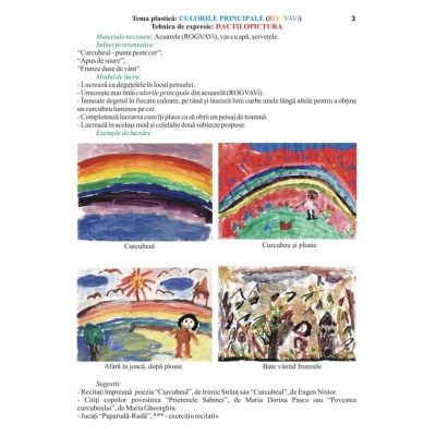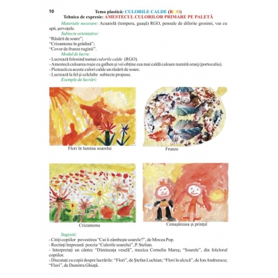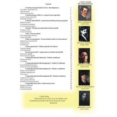 Lucrarea este organizată pe componentele de conţinut în conformitate cu programa pentru învăţământul preprimar. Structura fiecărei componente de conţinut prezintă tehnica de expresie pentru realizarea temei plastice, materiale necesare, subiecte orientative, modul de lucru pentru realizarea unui subiect, exemple de lucrări ale copiilor şi sugestii de poezii, texte literare, cântece şi jocuri adecvate. Introducerea copiilor în lumea culorilor va fi realizată prin sensibilizarea lor faţă de frumuseţile realităţii înconjurătoare şi prin observarea armoniei culorilor din natură. Sperăm că acest auxiliar, prin bogăţia conţinutului său, să fie un instrument de lucru atractiv pentru copiii de vârstă preşcolară şi, totodată o sursă de inspiraţie pentru adulţii din jurul micuţilor artişti. ATENTIE! Caietul are pagini goale pentru ca cei mici să poată lucra direct pe acesta şi astfel să poată păstra lucrările în caiet ca un portofoliu. FORMAT: 21 x 29,7 cm, 48 pag. color şi pagini goale pentru lucru, hârtie groasă 120 g/mp.