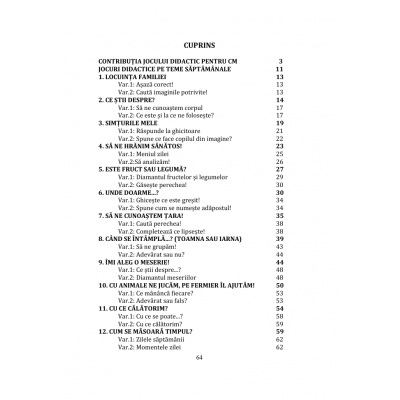 În cadrul jocurilor didactice și a variantelor propuse în această mapă, preșcolarii vor cunoaște aspecte ale lumii înconjurătoare: familie, activitatea oamenilor, corpul uman, meserii și profesii, anotimpuri, plante, animale, țara și localitatea natală, mijloace de transport, orientare în timp. De asemenea, preșcolarii au posibilitatea de a se dezvolta pe plan social, emoțional și intelectual.