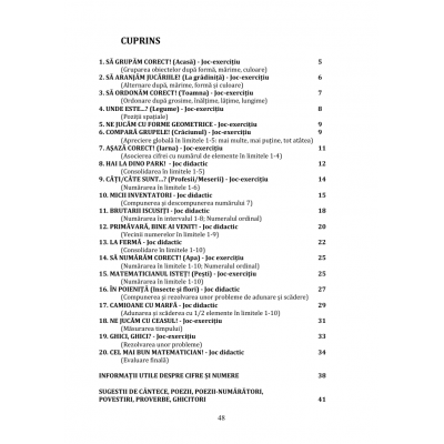 Pe parcursul temelor săptămânale sunt abordate majoritatea obiectivelor pentru activități matematice: constituirea de grupe pe baza unor însușiri comune, efectuarea unor operații cu grupe de obiecte (comparare, clasificare, ordonare), aprecierea cantității prin punerea în corespondență, relații spațiale, forme geometrice, numărarea obiectelor și asocierea cu cifrele corespunzătoare, vecinii, compunerea și descompunerea unui număr, utilizarea numeralului ordinal, operații de adunare și scădere.