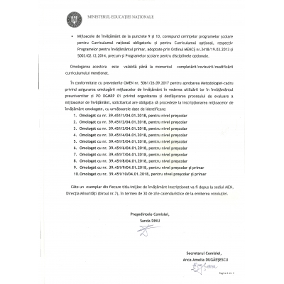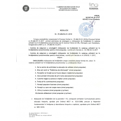 Mijloacele de învățământ prezentate spre omologare de către Editura Tehno-Art, au fost omologate conform Rezoluției 39.686/04.01.2018. Procesul de omologare este în desfășurare. Vă rugăm să urmăriți pe site-ul nostru rezultatele la zi.