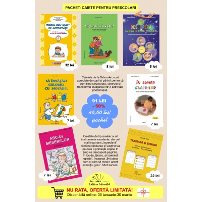 Pachetul conține 7 titluri: Primul meu caiet de activități, Vreau să știu, Descoperă lumea în care trăiești, Să învățăm culorile cu Motănel, În lumea culorilor, ABC-ul meseriilor, Trasează și șterge!