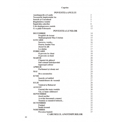 Cartea conţine scurte poveşti structurate pe două capitole mari: „Povestea anului” şi „Povestea lunilor”. În aceste poveşti sunt descrise cele 4 anotimpuri, ca soţii ale Anului şi cele 12 luni, ca fiice ale Anului. În „Povestea lunilor”, autoarea prezintă diferite aspecte specifice fiecărei luni, fiind ilustrat cel mai semnificativ moment al poveştii. FORMAT: 21 x 29 cm, 36 pag. color, hârtie lucioasă.