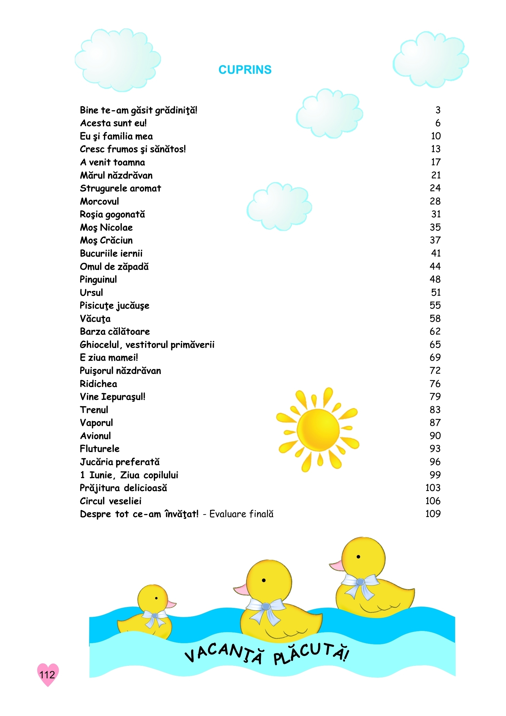 Aprobat OMEC Nr.6250 din 21.12.2020. 4 CAIETE INTR-UNUL SINGUR. Face parte dintr-un grup de 3 caiete care au fost concepute de cadre didactice cu experienţă, pentru fiecare an de studiu: 3-4 ani; 4-5 ani, 5-6 ani şi în concordanţă cu cerinţele curriculumului preşccolar. Fiecare caiet conţine mai multe subteme, iar fiecare subtemă are 3 sau 4 fişe pentru domeniile experienţiale: Ştiinţă - Cunoaşterea mediului; Limbă şi comunicare; Ştiinţă - Matematică; Om şi societate - Activităţi practice/Educaţie pentru societate. Aceste subteme pot fi utilizate, la alegerea educatoarei, în cadrul celor şase teme anuale de studiu. Sarcinile de lucru sunt adaptate vârstei, iar ilustraţiile sunt vesele şi atractive. Caietele conţin şi fişe de evaluare (iniţială, sumativă şi finală) pentru fiecare domeniu menţionat mai sus, copilul având şi posibilitatea de autoevaluare. Credem că acest proiect editorial este unul deosebit, având avantajul că un singur caiet acoperă cele mai importante domenii experenţiale dintr-un an de studiu. Caietele sunt utile atât cadrelelor didactice, cât şi părinţilor, în demersul lor comun: educaţia copiilor de vârstă preşcolară. Format 21 x 29 cm (A4), 112 pag. color.