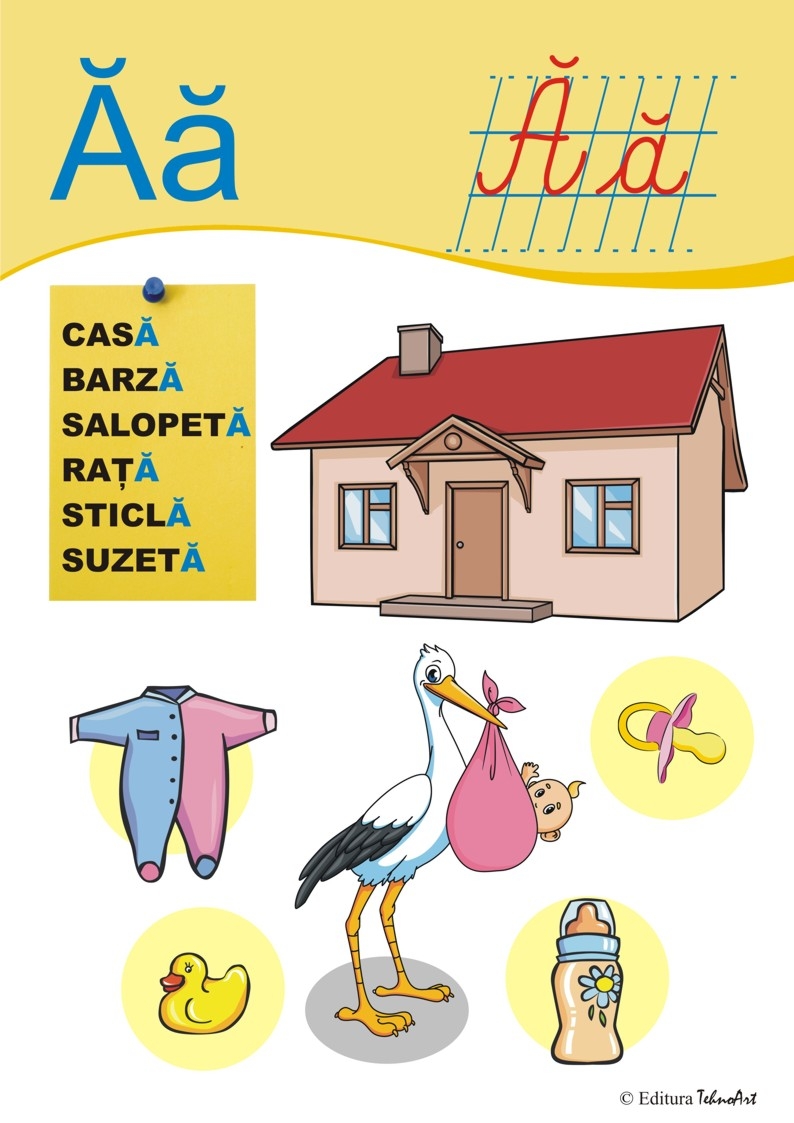 "Literele alfabetului" reprezintă un instrument auxiliar pentru preşcolari, şcolarii mici, în vederea însuşirii unor cunoştinţe referitoare la educarea limbajului. Planşele sunt ilustrate atractiv, concepute în acelaşi timp educativ, ajutându-i pe copii la învăţarea literelor mari şi mici de tipar cât şi a grupurilor de litere. Copiii pot fi îndrumaţi de către educatoare şi părinţi să parcurgă traseul grafic al literelor cu degetul arătător, ceea ce le înlesneşte efectuarea semnelor grafice cu instrumentul de scris pe foaia de caiet simplă sau cu reţea de sprijin pentru scrierea literelor de tipar şi implicit învăţarea acestora cu o mai mare uşurinţă. Aceste planşe contribuie la dezvoltarea şi îmbogăţirea vocabularului copiilor, stimulând intuiţia, atenţia şi memoria, Înlesnind calea spre comunicare între adult şi copil cât şi explorarea realităţii înconjurătoarea. În acelaşi timp, ţinând seama de curriculum pentru învăţământul preşcolar, pregătirea copiilor pentru şcoală este importantă şi se realizează atât ân grădiniţe cât şi în familie, iar realitatea cu care copilul vine în contact şi apare convertită şi în semnificaţii fixate în cuvinte cît şi în cod lingvistic mai puţin accesibil lui. Rolul adultului este esenţial şi astfel, jucându-se, copilul învaţă noţiuni noi care vin în sprijinul lui în vederea însuşirii alfabetului limbii române şi implicit trecerea spre citirea literelor şi grupurilor de litere. Recomand "Alfabetul pentru preşcolari" atât educatoarelor cât şi învăţătorilor care conduc clasa I cu specificarea îmbogăţirii conţinutului astfel încât cuvântul să conţină litera iniţială la început aşa cum sunt ilustrate aceste planşe, cât şi la mijlocul cuvântului sau la sfârşitul acestuia. FORMAT: 21 x 29,7 cm, 39 planşe color pe carton de 250g/mp. CONŢINE POSTER CU LITERELE.