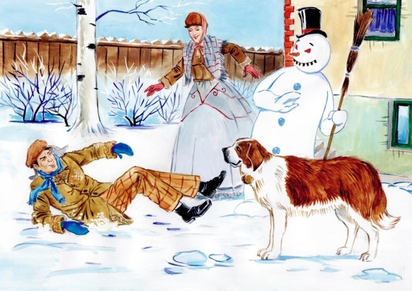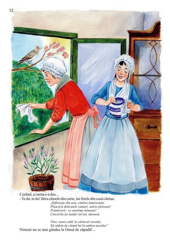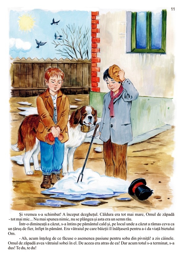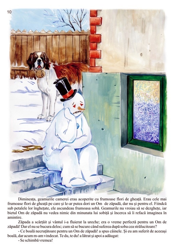 În această poveste cele două personaje principale au trăiri asemănătoare oamenilor, iar întreaga natură este descrisă de parcă ar fi desprinsă dintr-un basm: "covorul de zăpadă ce învelea pământul părea acoperit cu diamante ce sclipeau mai albe decât zăpada însăşi". Omul de zăpadă trăieşte într-o lume limitată, curtea casei. El se îndrăgosteşte de vâlvătaia unei sobe, o dragoste fără speranţă, deoarece condiţia lui nu-i permite să ajungă la ea. Soba face parte dintr-o altă lume, la care Omul de zăpadă poate doar visa. În paralel cu viaţa Omului de zăpadă, simbolizând viaţa omului cu suflet pur, ne este prezentată viaţa câinelui, care ilustrează cum este tratat omul în societate. Câinele, pe vremea când era tânăr şi îi bucura pe stăpâni, locuia în casă, avea mâncare, căldură şi se bucura de dragostea celor din jur. La bătrâneţe el a fost alungat din casă şi legat în lanţuri, aşteptând resemnat sfârşitul, de care, spre deosebire de Omul de zăpadă, era conştient: "Te du, te du, cum o să mă duc şi eu!..." FORMAT: 21 x 29,7 cm, 12 pag. color, hârtie lucioasă, cu PUZZLE.