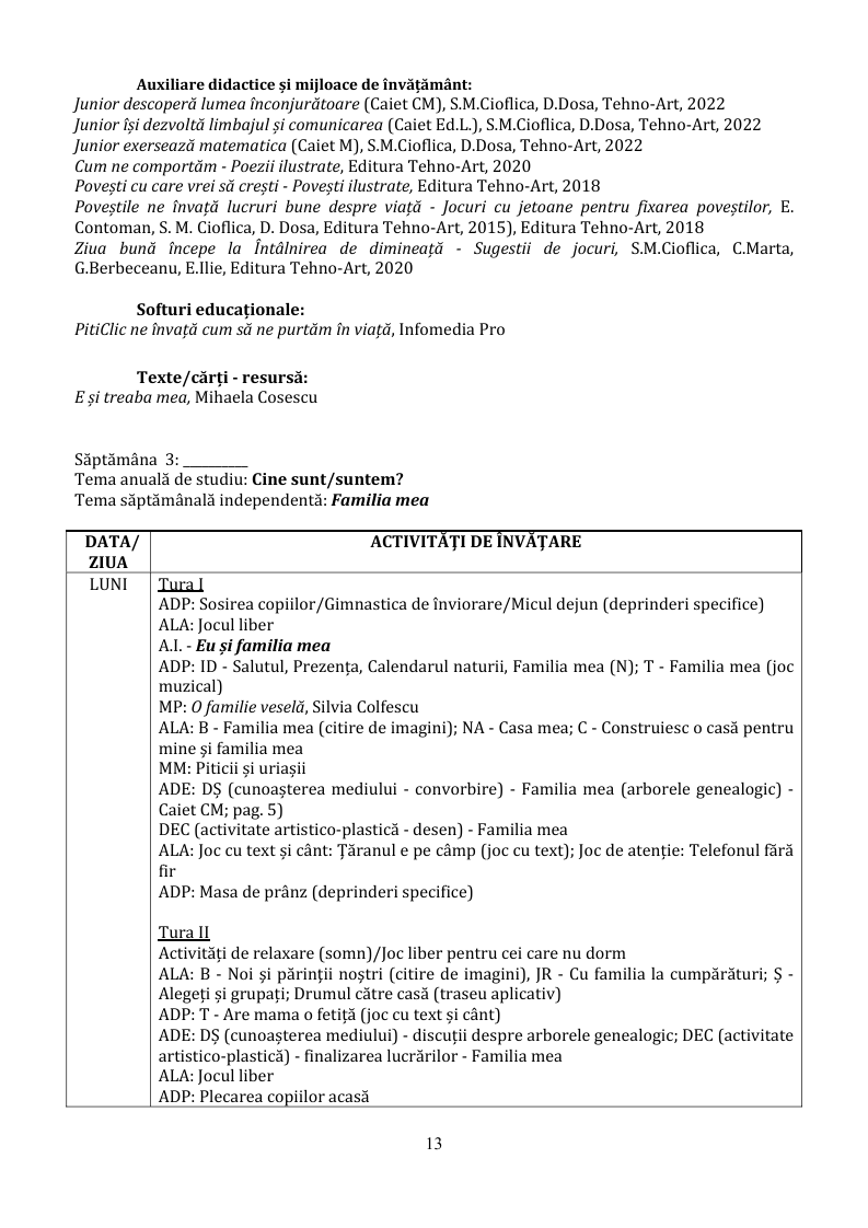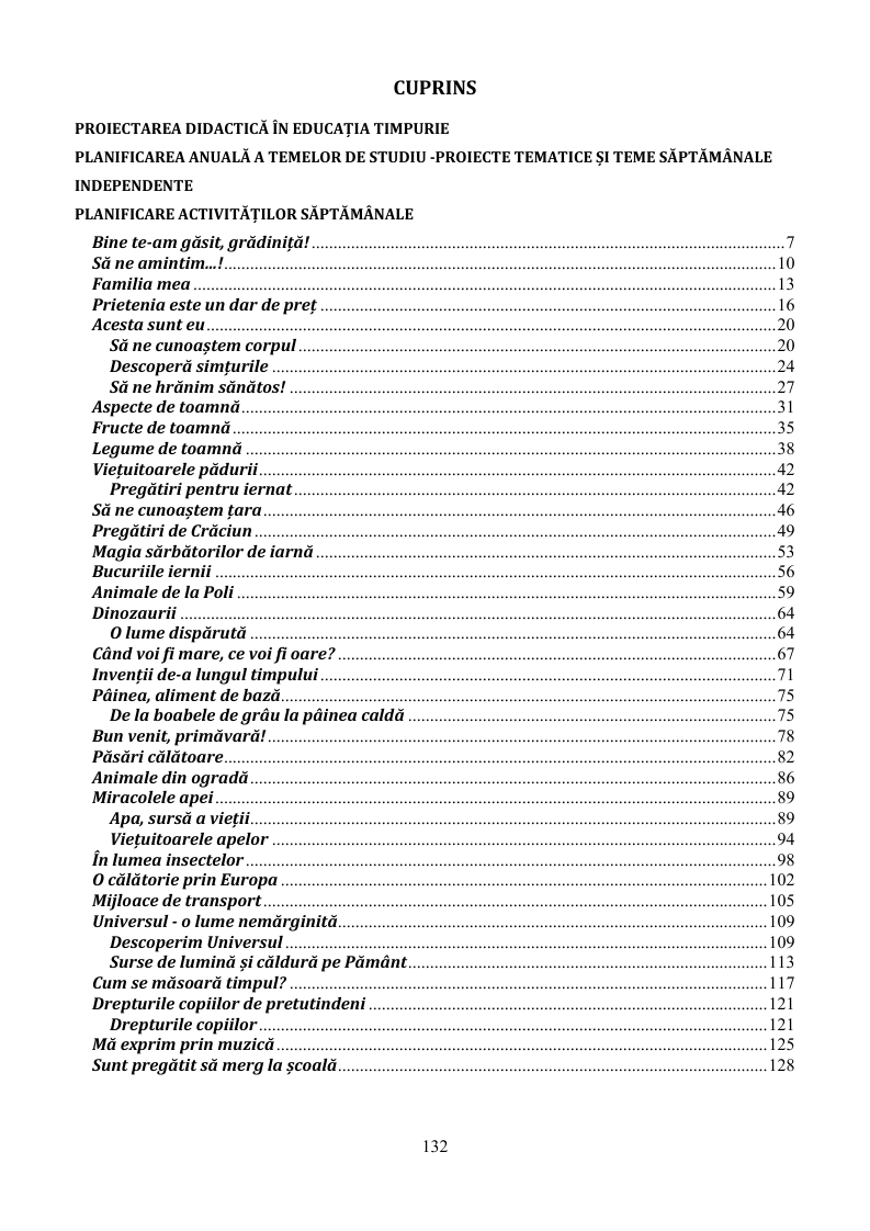 Lucrarea conține planificarea calendaristică realizată într-o manieră integrată a activităților didactice, proiectată pe baza celor șase teme anuale de studiu, pe teme săptămânale și în conformitate cu prevederile Curriculumului pentru educația timpurie aprobat cu OMEN nr.4694 din 02.08.2019.