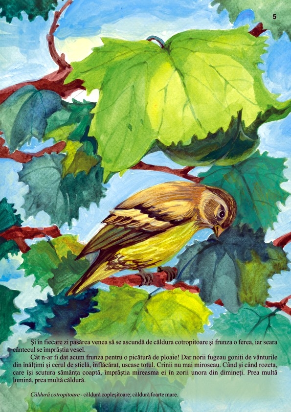 În povestire este surprinsă viaţa unei frunze de când apare, cum creşte în razele soarelui, în picăturile de ploaie, dând adăpost unui scatiu. CONŢINE PUZZLE