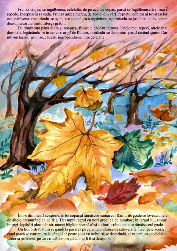 În povestirea "Frunza" este surprinsă viaţa unei frunze de când apare, cum creşte în razele soarelui, în picăturile de ploaie, dând adăpost unui scatiu. Frunza şi-a găsit sfârşitul lovită de aripa acestuia, soarta ei fiind o tristă ilustrare a proverbului "După ce a trecut căldura, nu-şi mai aminteşte de umbră". Cu emoţie şi parcă înlăcrimat, scriitorul redă contrastul dintre armonia şi tragedia naturii lăsându-ne să reflectăm asupra acestor aspecte. Autorul nu are intenţia de a ne instrui, dar citind o astfel de povestire, ne face să fim mai atenţi, mai înţelegători şi mai umani cu tot ce ne înconjoară. FORMAT: 21 x 29,7 cm, 8 pag. color, hârtie lucioasă, PUZZLE.