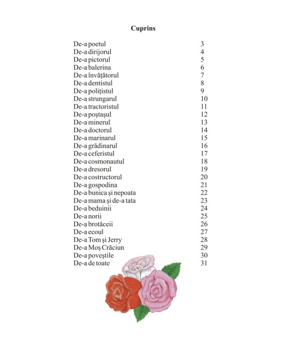 Conţine mai multe poezii prin intermediul cărora autoarea îi invită pe copii la joc. Astfel, ei vor descoperi viaţa într-un mod accesibil şi atractiv, cercetând-o şi transformând-o în experienţe personale.