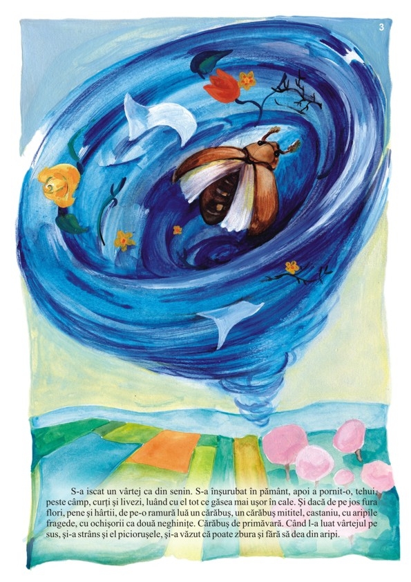 In povestirea "Sărăcuţul!..." sunt descrise câteva momente din viaţa unui cărăbuş de primăvară. Luat pe sus de un vârtej şi lăsat în mijlocul unui drum de ţară, pe lângă el trec mari primejdii (un cocoş, un curcan şi un păun) care îl fac să simtă sfârşitul aproape. Când cărăbuşul crede că nu mai este în primejdie şi îşi spune: "Ei! De aşa păsări mici, mai de seama mea, mi-i drag şi mie", atunci puiul de sturz "deschise pliscul, apucă, cu lăcomie cărăbuşul, şi: hap! hap - mai să se înece îl înghiţi.". Această povestire este însoţită de ilustraţii sugestive, iar la mijlocul cărţii există o imagine (format A3) în care este surprins momentul principal al povestirii şi care poate fi folosită ca tablou sau ca puzzle. FORMAT: 21 x 29 cm, 8 pag. color, hârtie luciasă, PUZZLE.