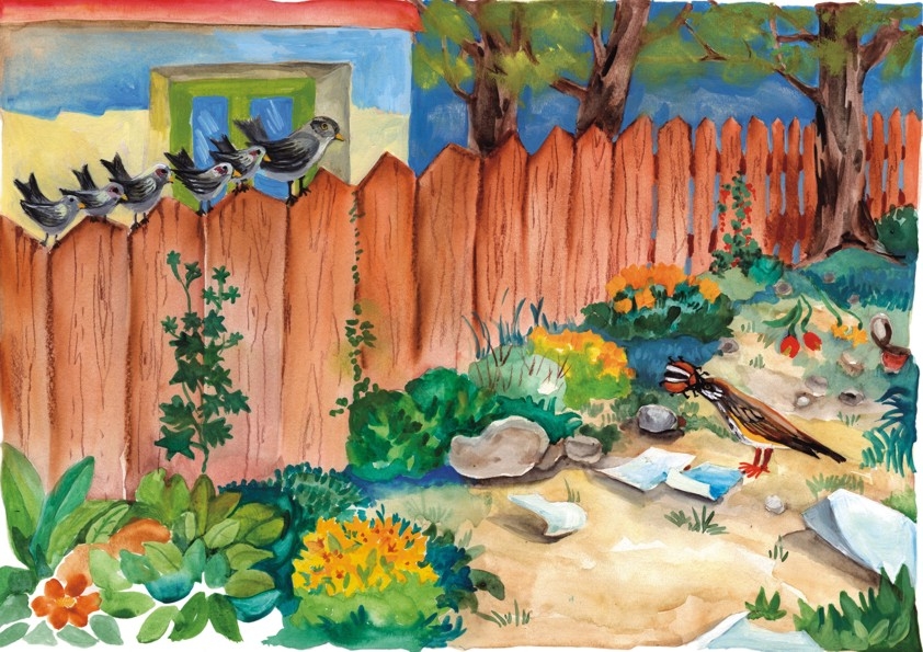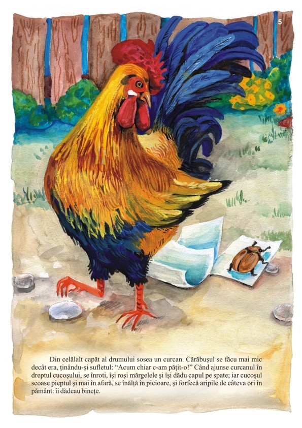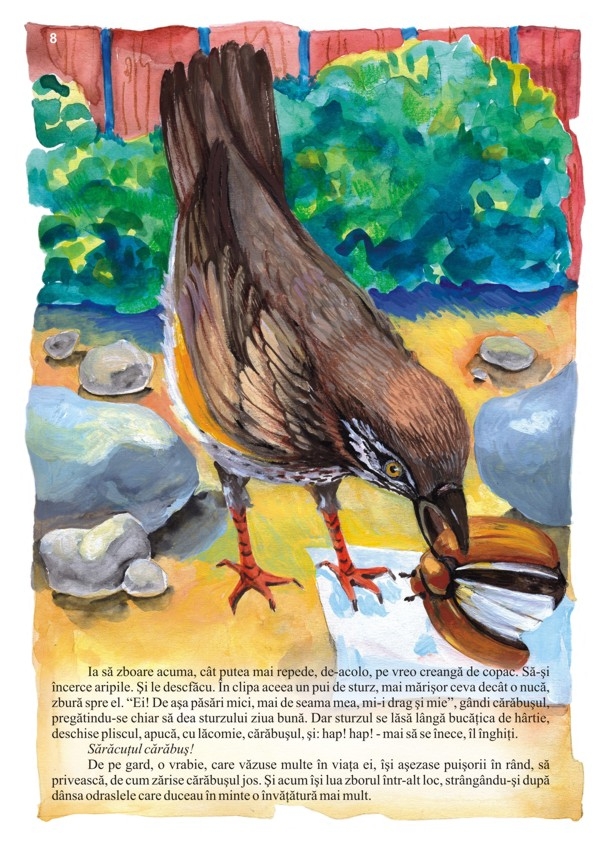 Când cărăbuşul crede că nu mai este în primejdie şi îşi spune: "Ei! De aşa păsări mici, mai de seama mea, mi-i drag şi mie", atunci puiul de sturz "deschise pliscul, apucă, cu lăcomie cărăbuşul, şi: hap! hap - mai să se înece îl înghiţi."