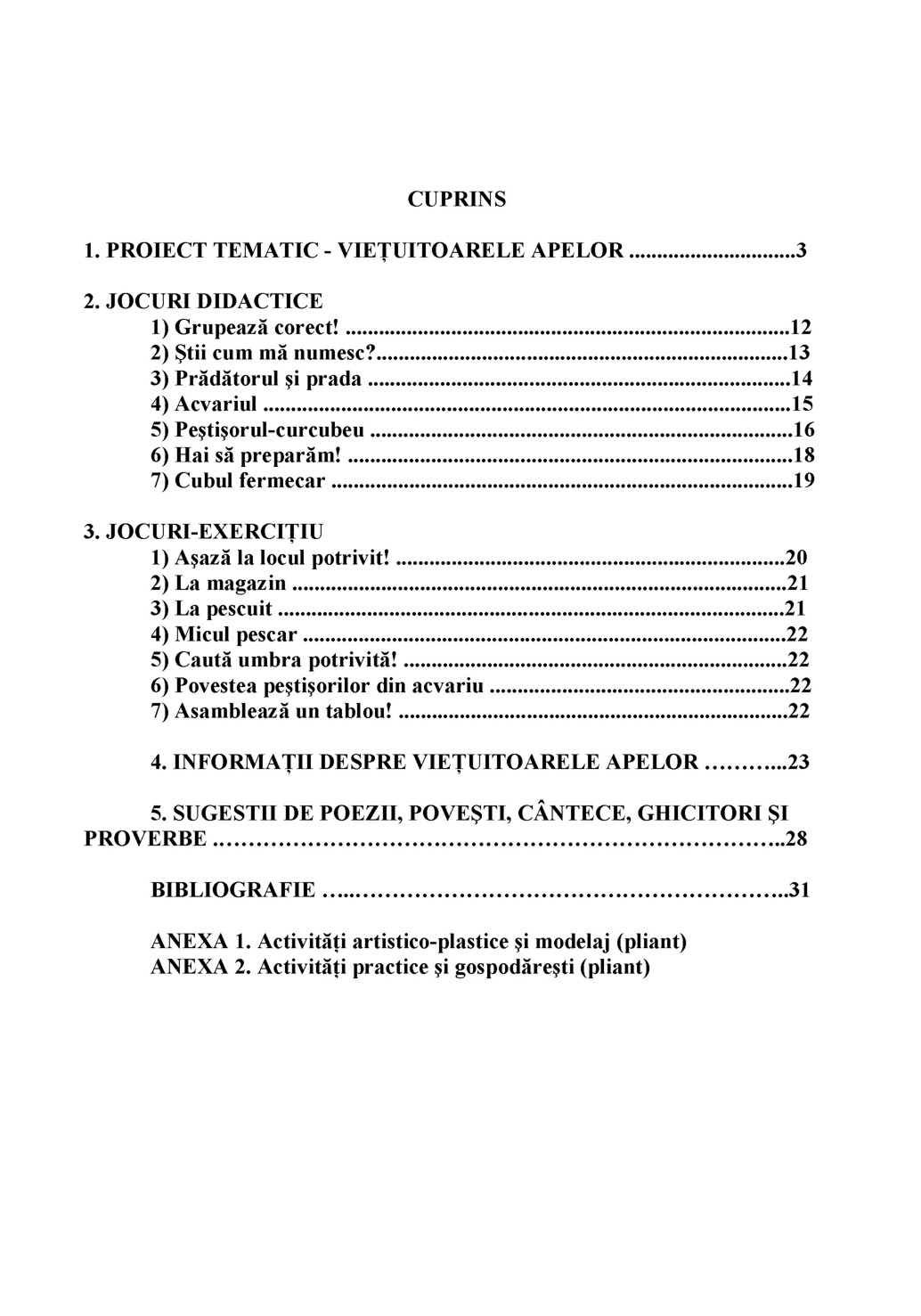 Elementul declanşator al acestui proiect derivă din curiozitatea copiilor, din faptul că ei sunt fascinaţi de lumea animalelor subacvatice. Doresc să cunoască aproape totul despre aceste vieţuitoare: modul de viaţă, hrana şi importanţa lor pentru om. Astfel, autoarele au creat situaţii de învăţare relevante, care să le ofere posibilitatea de a explora şi înţelege lumea din jurul lor, în toată complexitatea ei. În cadrul jocurilor didactice propuse, pe lângă metodele tradiţionale, au fost folosite metode activ-participative pentru dezvoltarea gândirii critice şi de învăţare prin cooperare: ghicitorile, explozia stelară, cubul, puzzle.