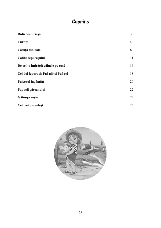 Cuprins: Ridichia uriaşă; Turtiţa; Căsuţa din oală; Coliba iepuraşului; De ce l-a îndrăgit câinele pe om?; Cei doi iepuraşi: Puf-alb şi Puf-gri; Puişorul îngâmfat; Papucii gâscanului; Găinuşa roşie; Cei trei purceluşi, total 64 de planșe + carte cu texte.