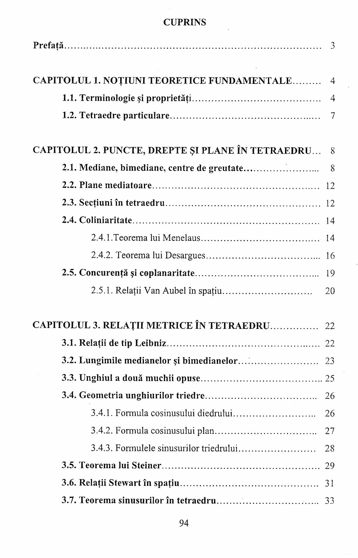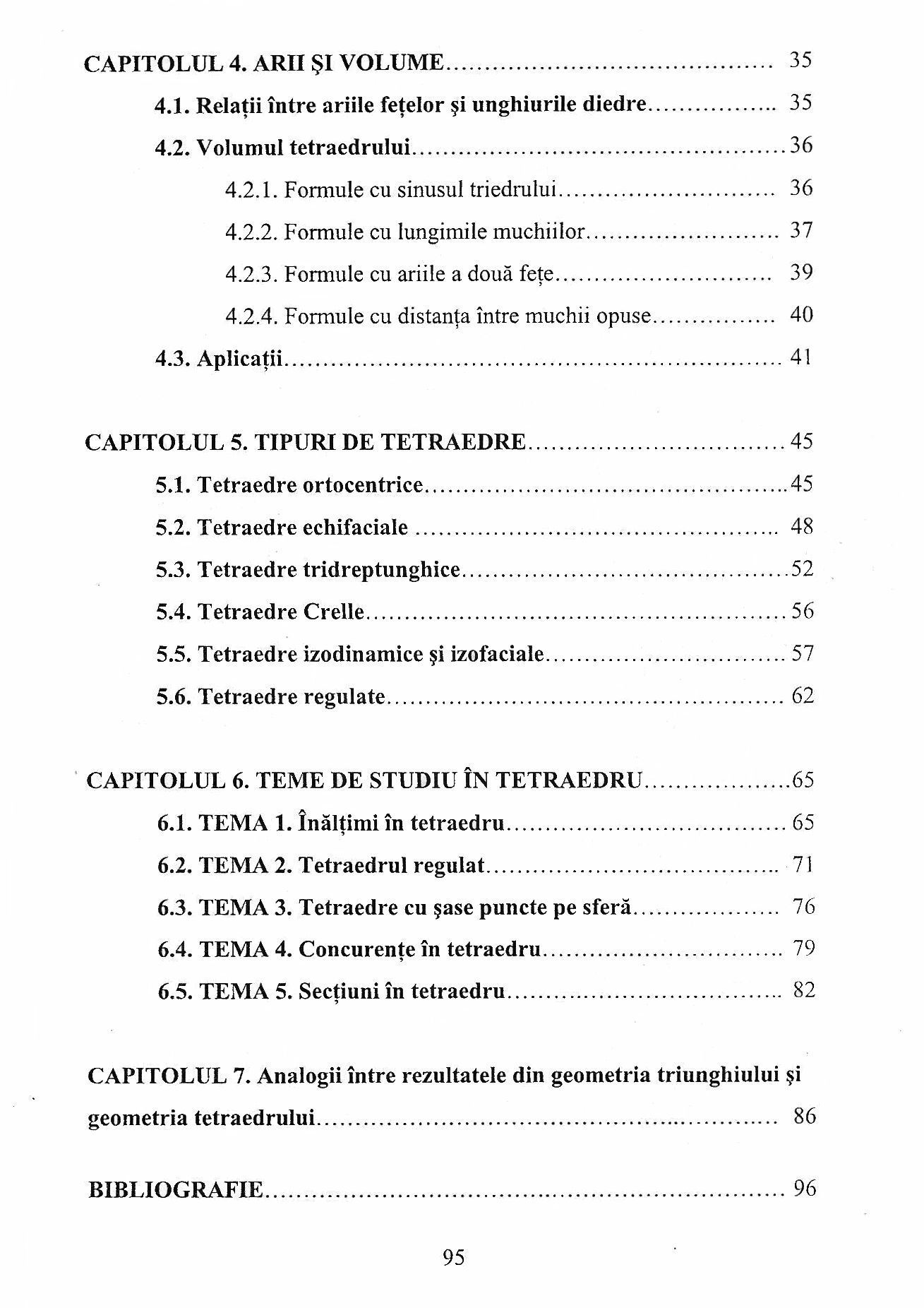 La nivelul învăţământului preuniversitar și universitar, rolul conceptelor figurale în studiul geometriei în spaţiu este deosebit de important pentru înţelegerea acestei ramuri a geometriei. Formarea conceptelor geometrice spaţiale, spre deosebire de altele, ridică probleme deosebite de reprezentare a corpurilor tridimensionale și vederea lor în spaţiu. Cea mai simplă distribuţie spaţială o constituie tetraedrul, corp geornetric ce face obiectul prezentei lucrări. Capitolul 1, intitulat ”Noţiuni teoretice fundamentale", conţine o prezentare teoretică condensată a cunoştinţelor fundamentale legate de tetraedru. Următoarele trei capitole sunt intitulate: "Puncte, drepte plane în tetraedru", ”Relaţii metrice în tetraedru", ”Arii și volume". Fiecare dintre paragrafele acestor trei capitole este dedicat unei tematici relativ delimitate și conţine enunţurile și demonstraţiile unor teoreme clasice de geometrie a tetraedrului. Capitolul 5, "Tipuri de tetraedre" prezintă principalele tipuri de tetraedre cu definiţiile și proprietăţile specifice fiecărui tip (tetraedre ortocentrice, tetraedre echifaciale, tetraedre tridreptunghice, tetraedre Crelle, tetraedre izodinamice şi izofaciale, tetraedre regulate). Capitolul 6, "Teme de studiu în tetraedru" prezintă o modalitate de susţinere în cadrul orelor de extindere, a temei "Tetraedrul”. Cele cinci teme din cadrul acestui capitol se referă la raţionamente fundamentale, utilizate în rezolvarea problemelor de geometrie a tetraedrului. În ultimul capitol s-a încercat o analogie între teoreme clasice de geometrie a triunghiului și corespondentele acestora din geometria tetraedrului. Lucrarea este concepută astfel, încât să vină în sprijinul elevilor din gimnaziu şi liceu, precum și a studenţilor din cadrul facultăţilor de profil. Ea este, de asemenea, utilă profesorilor de matematică din învăţământul gimnazial liceal, în munca lor la catedră, în cadrul cercurilor de elevi, sau pentru pregătirea concursurilor şcolare.