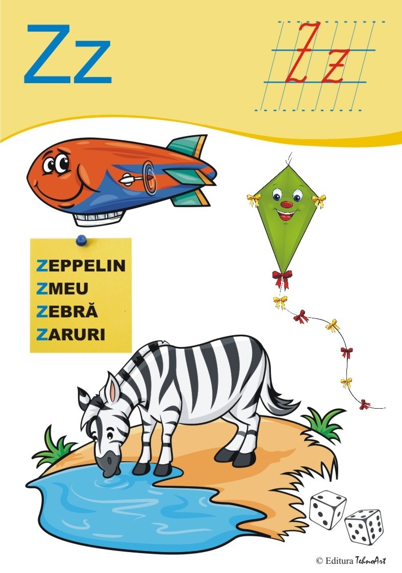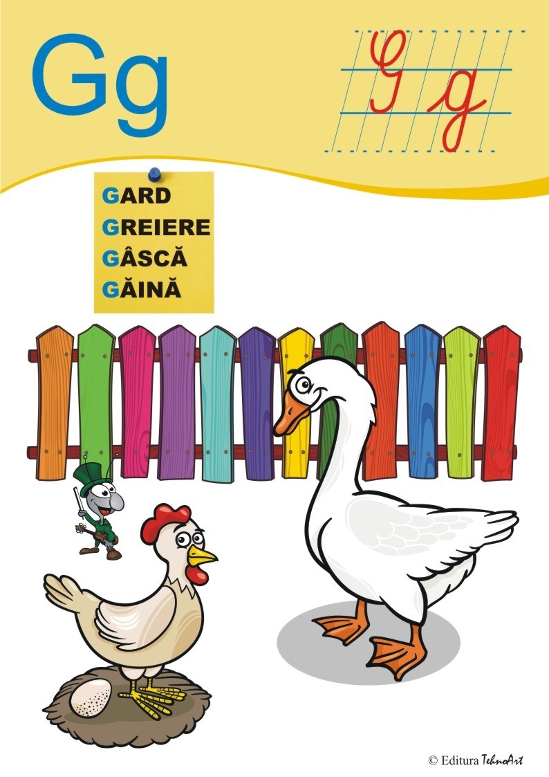 "Literele alfabetului" reprezintă un instrument auxiliar pentru preşcolari, şcolarii mici, în vederea însuşirii unor cunoştinţe referitoare la educarea limbajului. Planşele sunt ilustrate atractiv, concepute în acelaşi timp educativ, ajutându-i pe copii la învăţarea literelor mari şi mici de tipar cât şi a grupurilor de litere. Copiii pot fi îndrumaţi de către educatoare şi părinţi să parcurgă traseul grafic al literelor cu degetul arătător, ceea ce le înlesneşte efectuarea semnelor grafice cu instrumentul de scris pe foaia de caiet simplă sau cu reţea de sprijin pentru scrierea literelor de tipar şi implicit învăţarea acestora cu o mai mare uşurinţă. Aceste planşe contribuie la dezvoltarea şi îmbogăţirea vocabularului copiilor, stimulând intuiţia, atenţia şi memoria, Înlesnind calea spre comunicare între adult şi copil cât şi explorarea realităţii înconjurătoarea. În acelaşi timp, ţinând seama de curriculum pentru învăţământul preşcolar, pregătirea copiilor pentru şcoală este importantă şi se realizează atât ân grădiniţe cât şi în familie, iar realitatea cu care copilul vine în contact şi apare convertită şi în semnificaţii fixate în cuvinte cît şi în cod lingvistic mai puţin accesibil lui. Rolul adultului este esenţial şi astfel, jucându-se, copilul învaţă noţiuni noi care vin în sprijinul lui în vederea însuşirii alfabetului limbii române şi implicit trecerea spre citirea literelor şi grupurilor de litere. Recomand "Alfabetul pentru preşcolari" atât educatoarelor cât şi învăţătorilor care conduc clasa I cu specificarea îmbogăţirii conţinutului astfel încât cuvântul să conţină litera iniţială la început aşa cum sunt ilustrate aceste planşe, cât şi la mijlocul cuvântului sau la sfârşitul acestuia. FORMAT: 21 x 29,7 cm, 39 planşe color pe carton de 250g/mp. CONŢINE POSTER CU LITERELE.