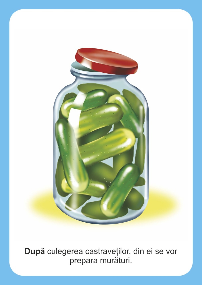 Mapa conţine 45 de jetoane (15 seturi cu câte 3 imagini cu secvențe temporale). Cu ajutorul acestor jetoane copiii ordonează cronologic imaginile cu secvențe temporale, care arată intervalul de timp situat între cele trei evenimente succesive, de aceeași natură. Apoi, copiii pot alcătui propoziții, folosind cuvintele: înainte, acum, după și pot crea povești pentru fiecare set cu imagini.