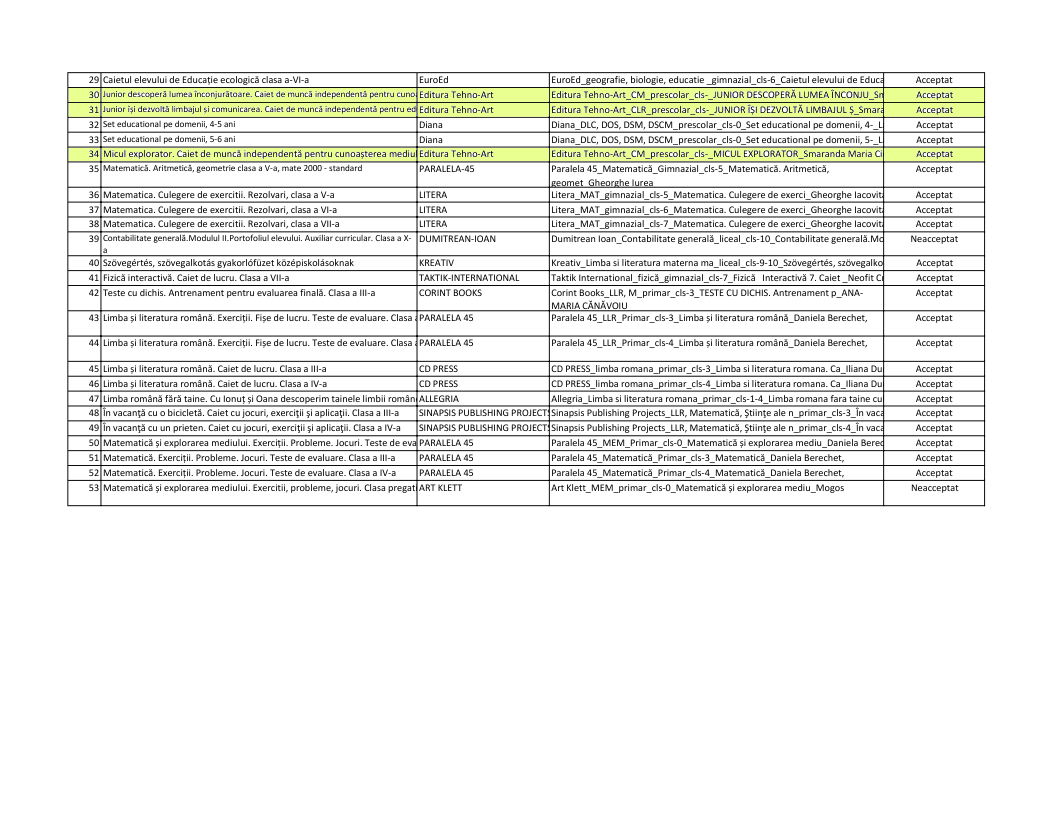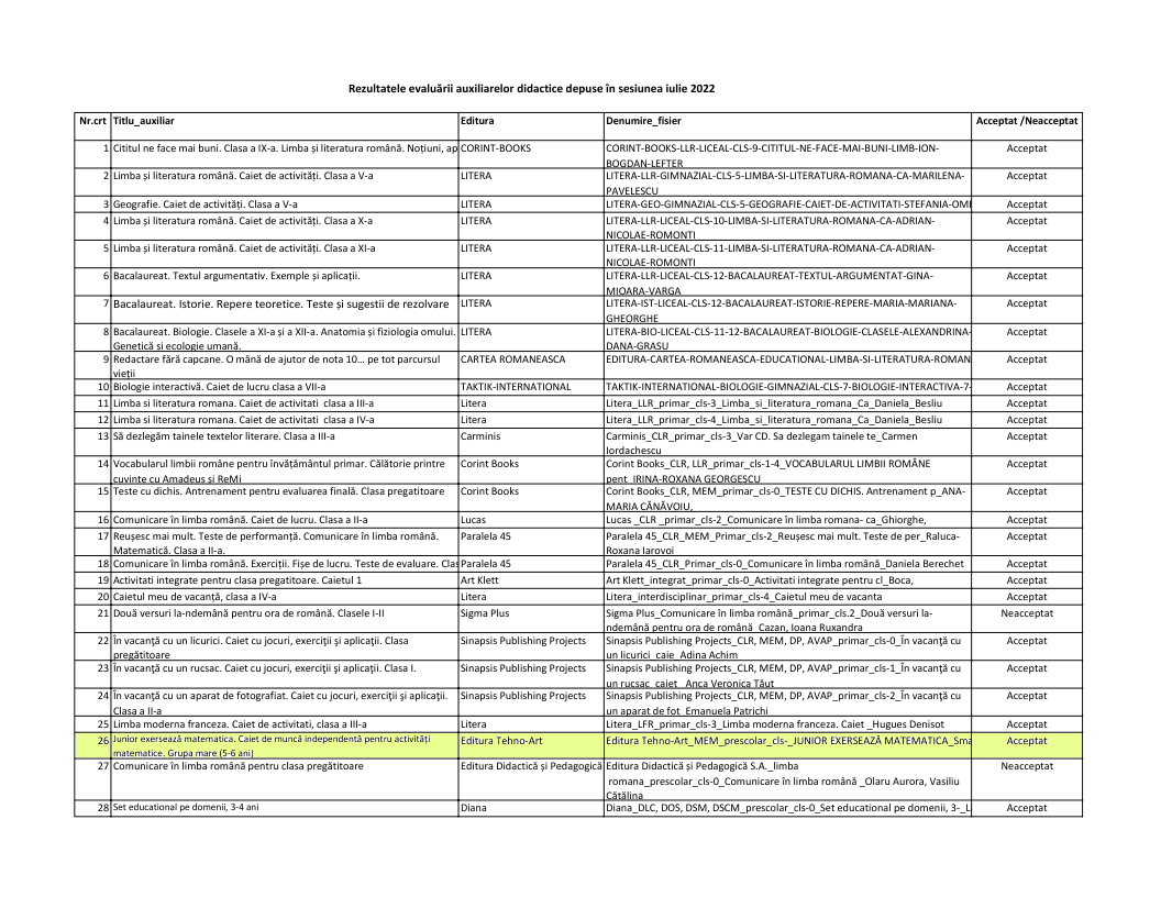Lista cu auxiliarele didactice avizate de către CENTRUL NAȚIONAL DE POLITICI ȘI EVALUARE ÎN EDUCAȚIE sesiunea iulie 2022 https://rocnee.eu/images/rocnee/fisiere/auxiliare/Rezultatele_evalu%C4%83rii_auxiliarelor_didactice_depuse_%C3%AEn_sesiunea_iulie_2022.pdf