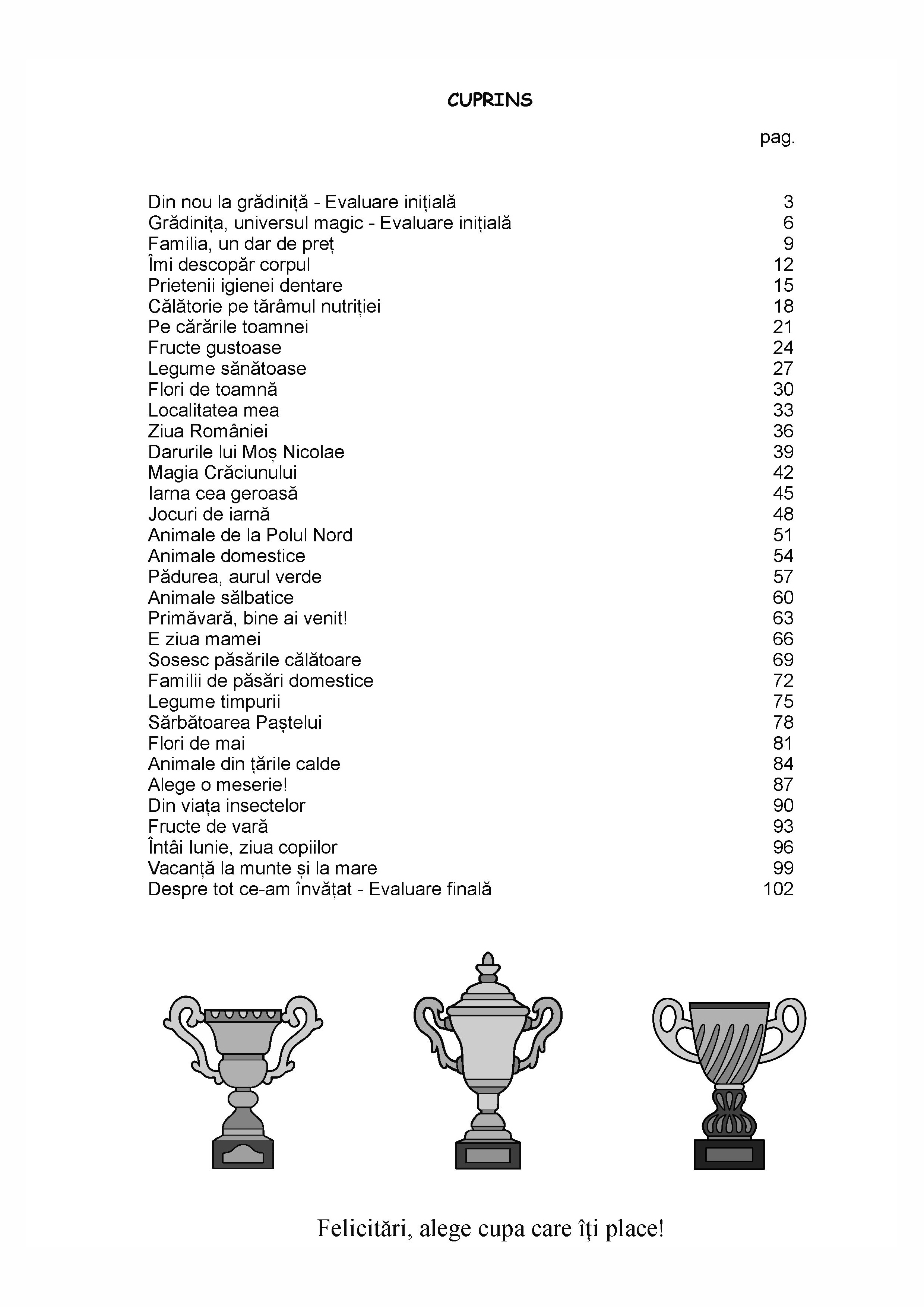Această nouă serie de caiete denumite Caietul preșcolarului pentru grupa mică, mijlocie și mare a fost concepută într-o manieră atractivă pentru copiii preșcolari, având avantajul că este un singur caiet pentru fiecare grupă, care acoperă cele mai importante domenii experiențiale dintr-un an de studiu: Domeniul Știință - Cunoașterea mediului, Domeniul Limbă și comunicare, Domeniul Știință - Activități matematice. Caietele sunt ușor de manevrat, bine planificate și abordează cunoștințe în mod gradual, de la grupa mică la grupa mare, fiind acoperită o mare parte din conținuturile învățării. Aceste auxiliare sunt recomandate atât pentru lucrul în grădiniță, cât și pentru cel de acasă și pot fi considerate o primă poartă de acces în studierea unei teme.