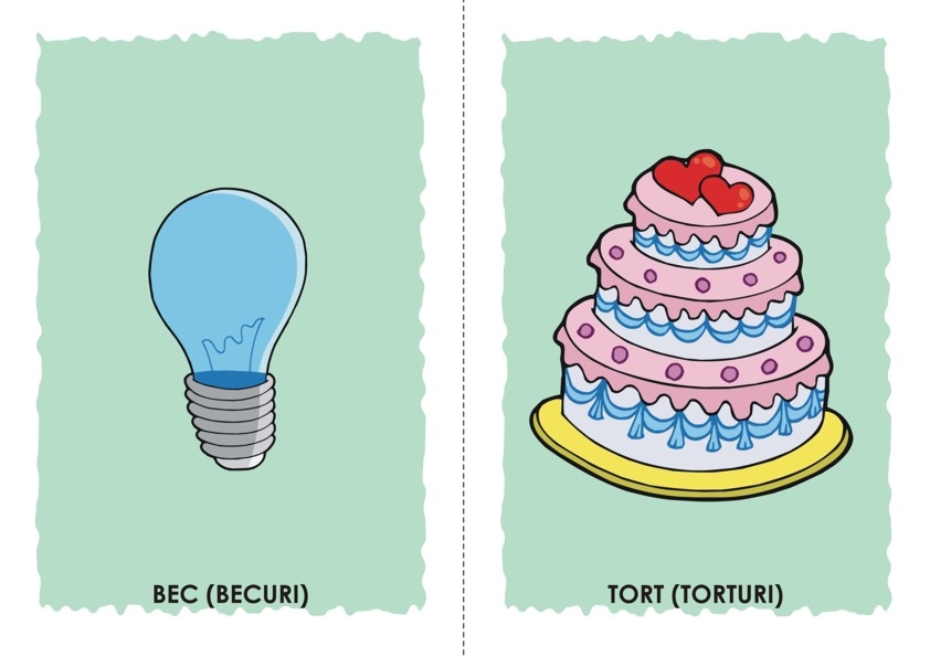 SĂ VORBIM CORECT! conţine jetoane cu ajutorul cărora copiii pot forma perechi între imagini (feminin-masculin: fată-băiat, oaie-berbec etc.). Se observă că unele imagini nu au pereche, ceea ce înseamnă că denumirea lor are o singură formă (girafă, furnică, elefant, fluture). O altă variantă de joc este “Eu spun una, tu spui multe” - un adult va denumi fiecare imagine de pe jetoane (fată, găină, pălărie, elefant, fluture, ac, măr etc.), iar copiii vor spune mai multe (fete, găini, pălării, ananaşi, struguri, furtunuri, treninguri etc.). Ei vor observa că unele denumiri sunt la fel şi la singular şi la plural (educatoare, arici, pui, ochelari, pantaloni). Astfel, prin joc, copiii vor învăţa cuvinte noi, pe care le vor utiliza în contexte adecvate. Format: 10x15 cm, carton 250 g/mp, 40 jetoane.