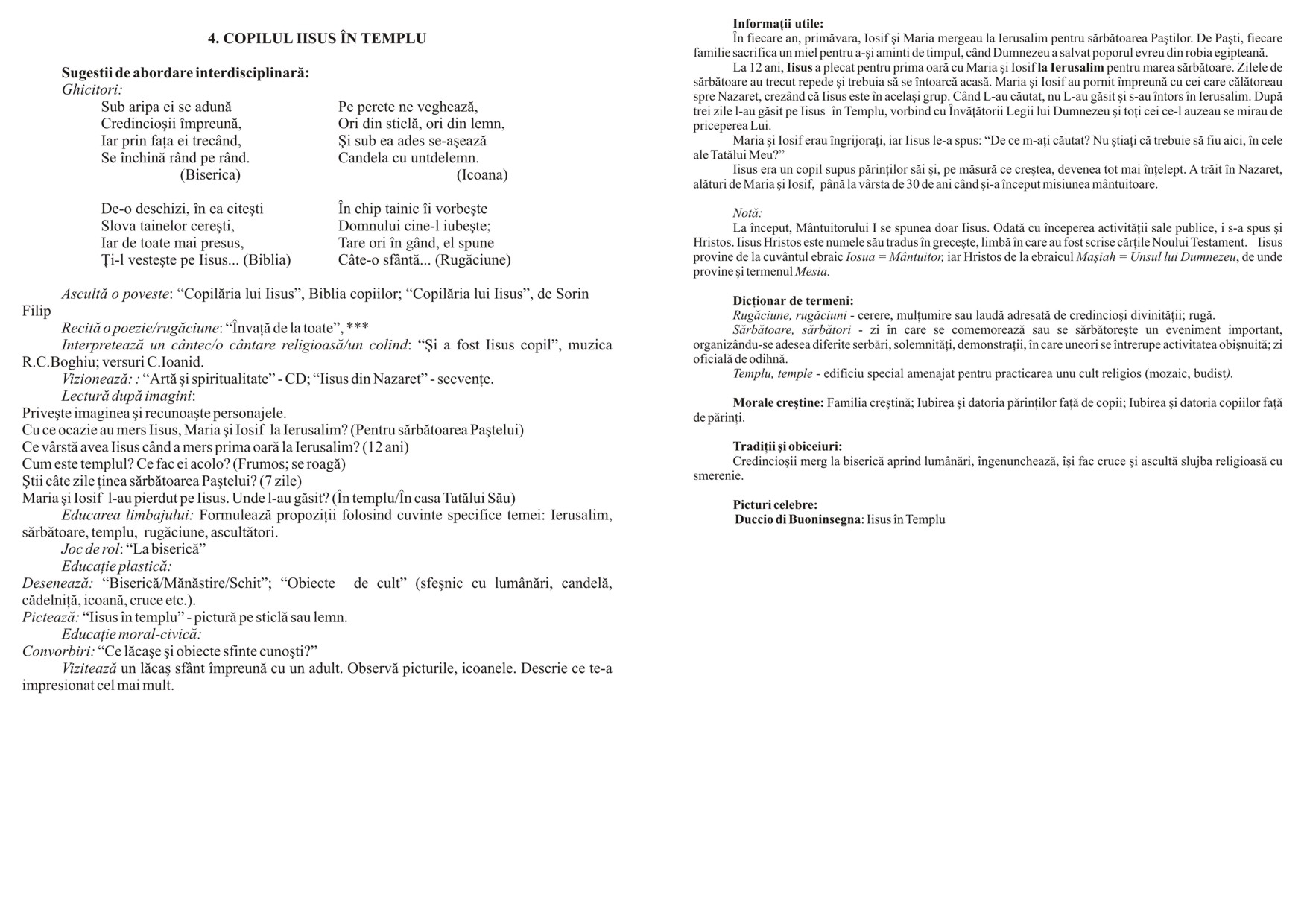 Aceste planşe, cu ilustraţii deosebite, pot fi folosite în cadrul activităţilor de Educaţie religioasă sau în cadrul diferitelor evenimente religioase de pe parcursul unui an şcolar (Paşte, Crăciun, Bobotează etc.).
