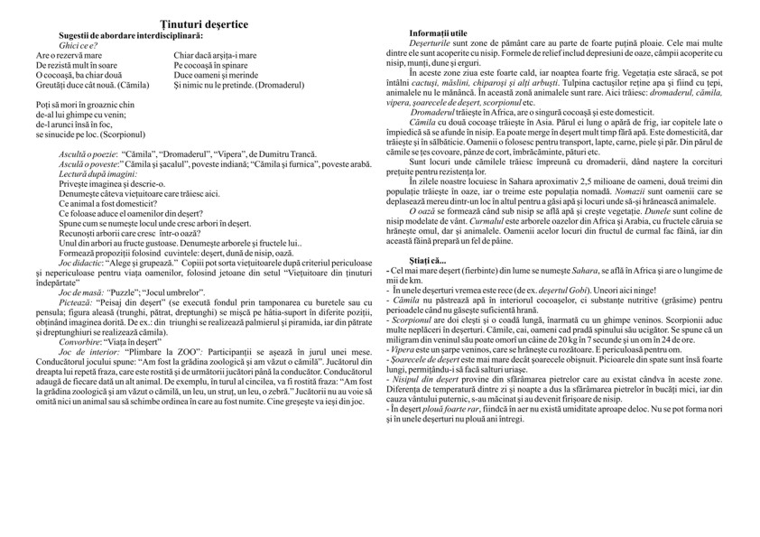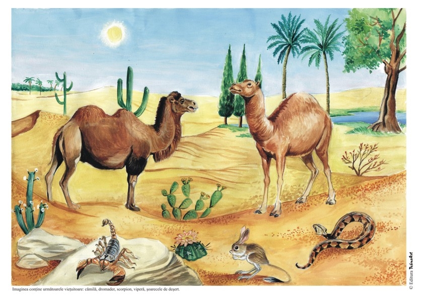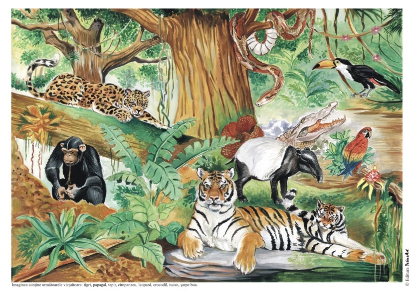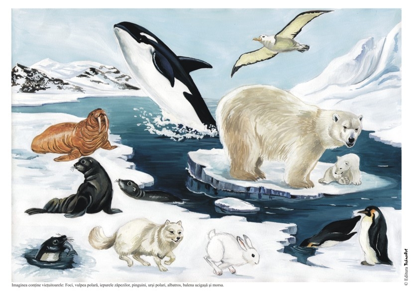 Setul VIEŢUITOARE ŞI MEDIUL LOR DE VIAŢĂ conţine: Savana africană – anotimpul secetos, Savana africană – anotimpul ploios, Jungla tropicală, Ţinuturi australiene, Ţinuturi polare, În tundră, În ţinuturile noastre; În râuri şi pâraie, În mări şi oceane. Planşele au ilustraţii deosebite şi pot fi utilizate pentru lectura după imagini. Pe verso se găsesc sugestii de întrebări pentru lectura după imagini, sugestii tematice pentru activităţile pe domenii experienţiale (ADE) şi pentru jocurile şi activităţile alese (ALA), în contextul în care abordăm o temă în cadrul unui proiect tematic. Se mai găsesc şi “Informaţii utile” despre vieţuitoarele menţionate. FORMAT: 21x29 cm, 10 planşe color legate în banderolă, text verso, carton 250 g/mp.