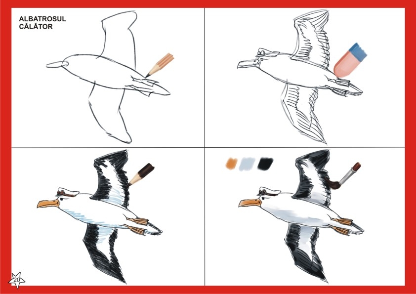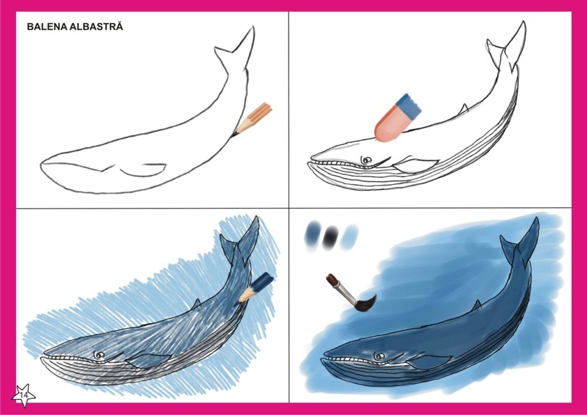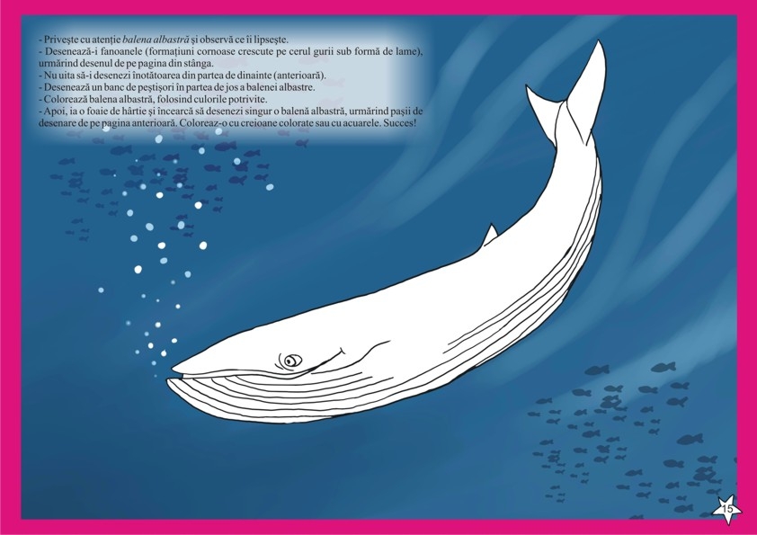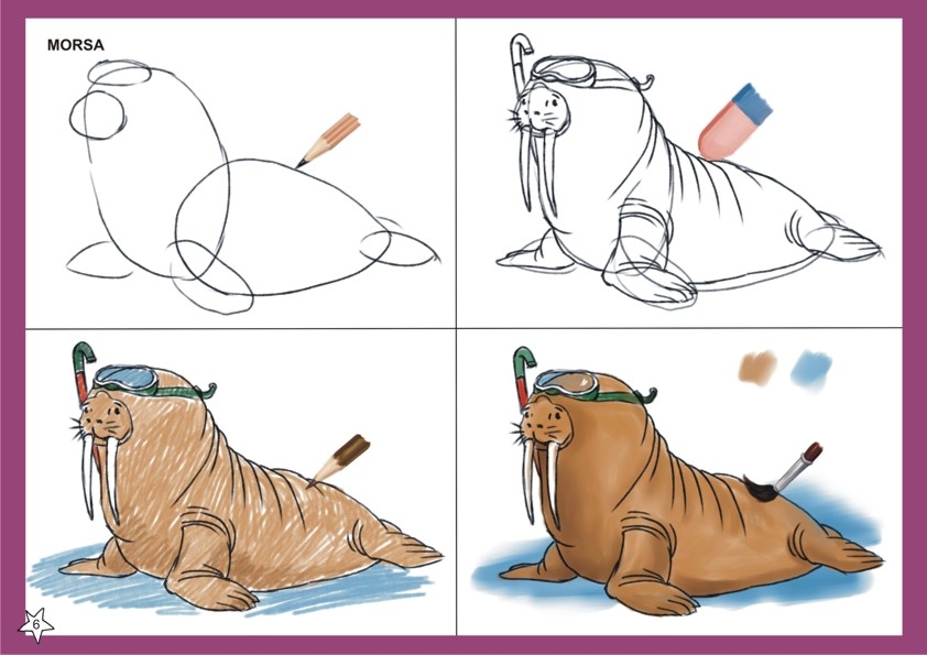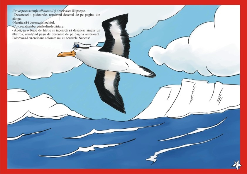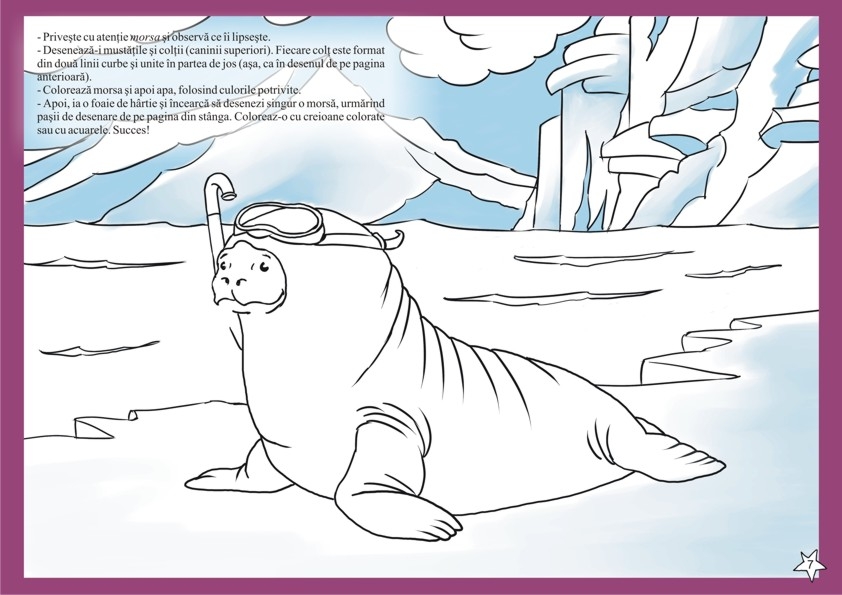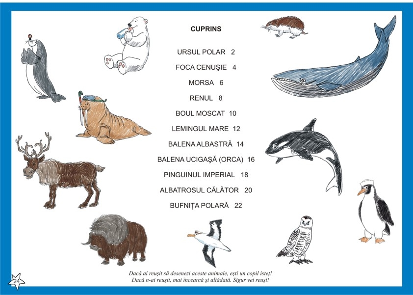 Cu ajutorul acestei cărţi copiii vor învăţa să deseneze, într-un mod plăcut, diferite animale care trăiesc în regiunile polare. Cartea este atractivă deoarece în prima etapă copilul este invitat să participe la finalizarea unui desen, care sigur va ieşi aşa cum trebuie! El completează (pe pagina din dreapta) anumite elemente, la fiecare animal sau numai la unele pe care le preferă, ghidându-se după desenul din partea stângă a cărţii. Cu această ocazie îşi formează mâna şi se familiarizează cu părţile componente ale corpului unui animal. Apoi, colorează doar o anumită porţiune din desen fără a fi pus în situaţia de a se plictisi, colorând la nesfârşit. Desenul finalizat, va fi păstrat în această carte ca într-un album. Într-o altă etapă copilul învăţă să deseneze un animal, parcurgând paşii de desenare de pe pagina din partea stângă a cărţii şi anume: 1. trasează uşor cu creionul o primă schiţă, formată din cercuri, ovale etc.; 2. adăugă linii mai exacte, iar liniile primei schiţe le va şterge; 3. alege o variantă de colorare (cu creioane colorate sau cu acuarelă) în funcţie de ceea ce îi place sau în funcţie de materialele de care dispune. Chiar dacă copilul nu reuşeşte să ducă la bun sfârşit o schiţă, el se familiarizează cu modul de desenare, revenind la această carte cu altă ocazie. FORMAT: 29 x 21 cm, 24 pag. color, hârtie 120 g.