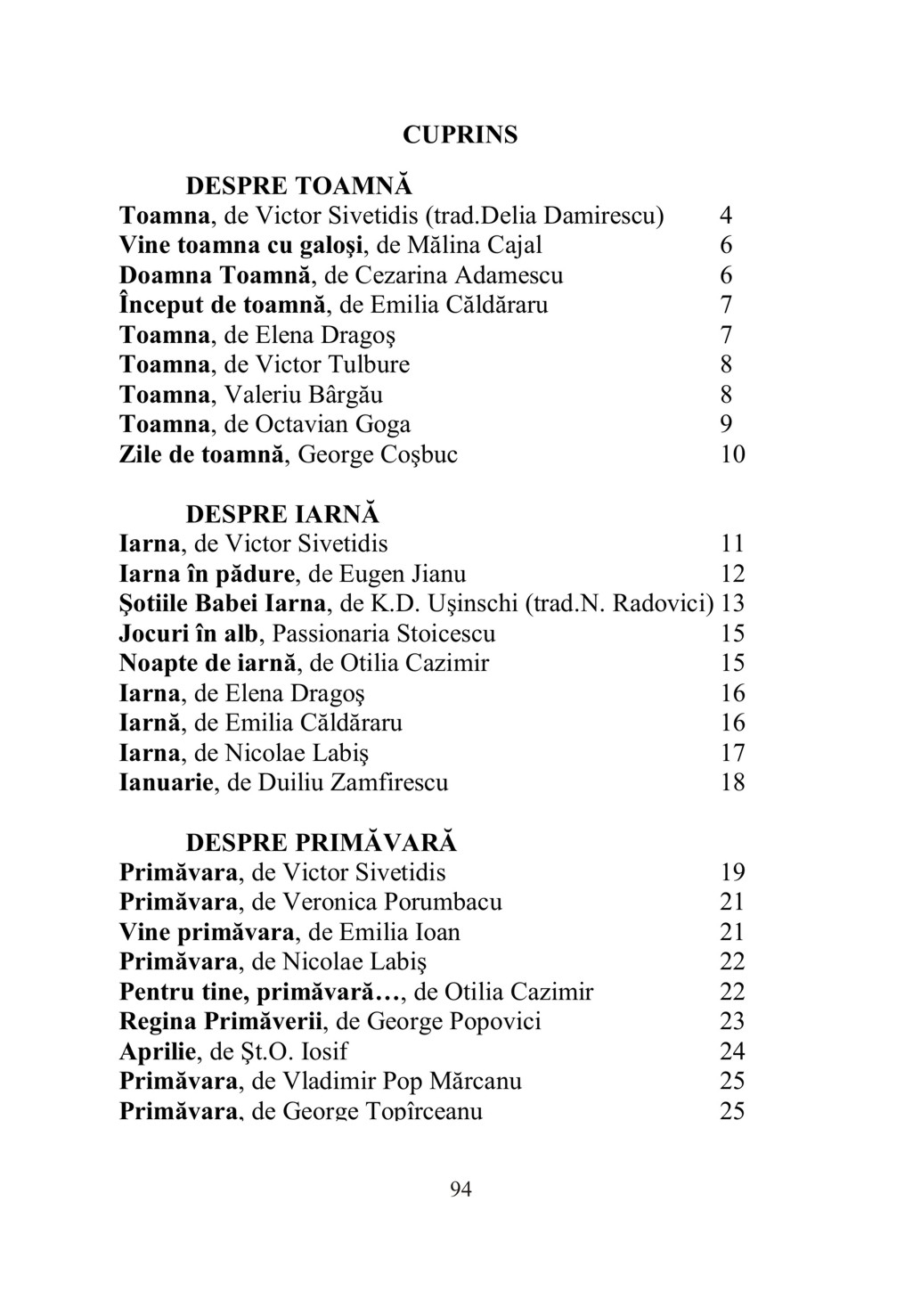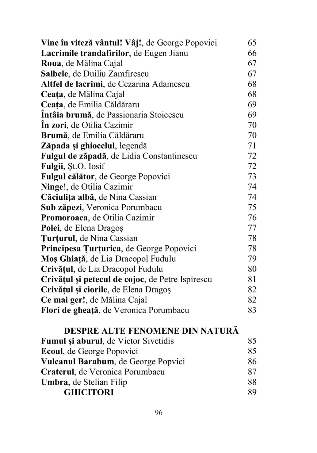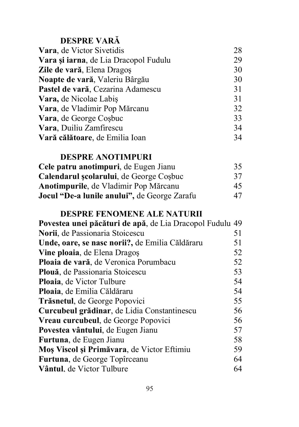 Culegerea “Despre anotimpuri şi fenomene ale naturii” cuprinde texte literare scrise de autori consacraţi, care au scris fie literatură pentru copii, fie literatură pentru adulţi, dar care au surprins temele în toată realitatea lor. Selectarea textelor literare s-a făcut în funcţie de teme, dar şi în funcţie de vârstă. Astfel, lucrarea este utilă pentru cadrele didactice din învăţământul preşcolar şi primar, având ca scop îmbogăţirea cunoştinţelor copiilor despre anotimpuri şi fenomene ale naturii şi totodată îmbogăţirea limbajului. Este utilă şi părinţilor care doresc să le dezvolte copiilor interesul pentru lectură. Diferitele specii literare (poveste, povestire şi poezie) sunt reunite pentru a descrie temele: toamnă, iarnă, primăvară, vară (alese în ordinea derulării unui an şcolar) şi fenomene ale naturii. De fapt, din aceste texte literare, reiese că succesiunea anotimpurilor determină schimbări esenţiale în viaţa oamenilor, plantelor şi animalelor datorită factorilor de mediu: vânt, ploaie, ger etc. Sperăm că, ascultând sau citind aceste texte literare, copiii vor fi atraşi de aceste teme, iar cunoştinţele acumulate le vor folosi în jocul: "Pregătirea pentru viaţă". FORMAT: 17 x 25 cm, 96 pag.