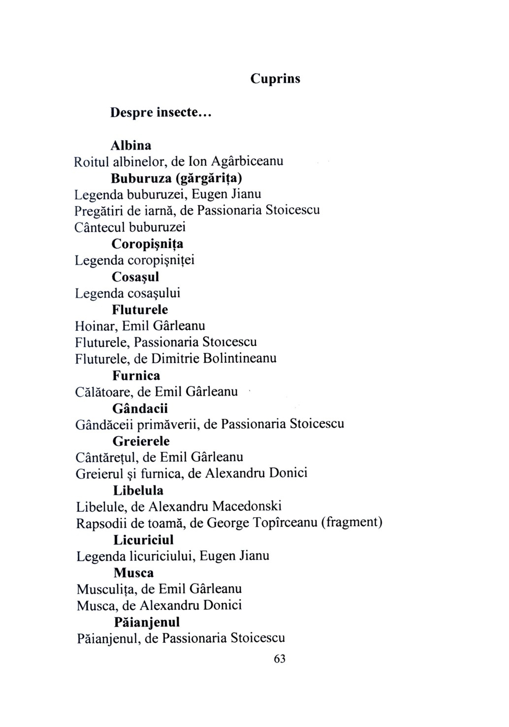 ISBN: [978-973-1842-14-1] Culegerea este destinată cadrelor didactice din învăţământul preşcolar şi şcolar, dar şi părinţilor care doresc să contribuie la îmbogăţirea cunoştinţelor copiilor despre insecte şi alte vieţuitoare mici din mediul înconjurător. Vezi "Citeşte un fragment" pentru cuprins.