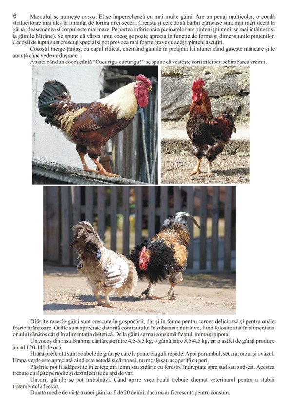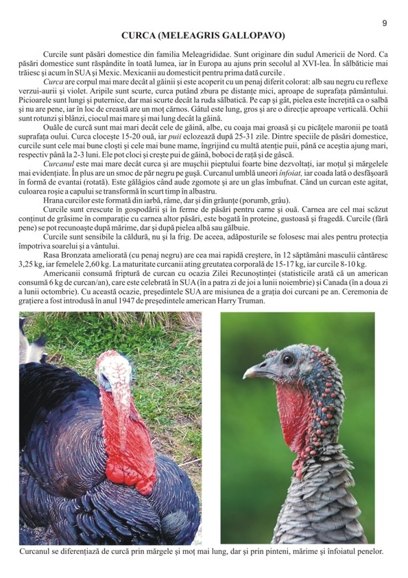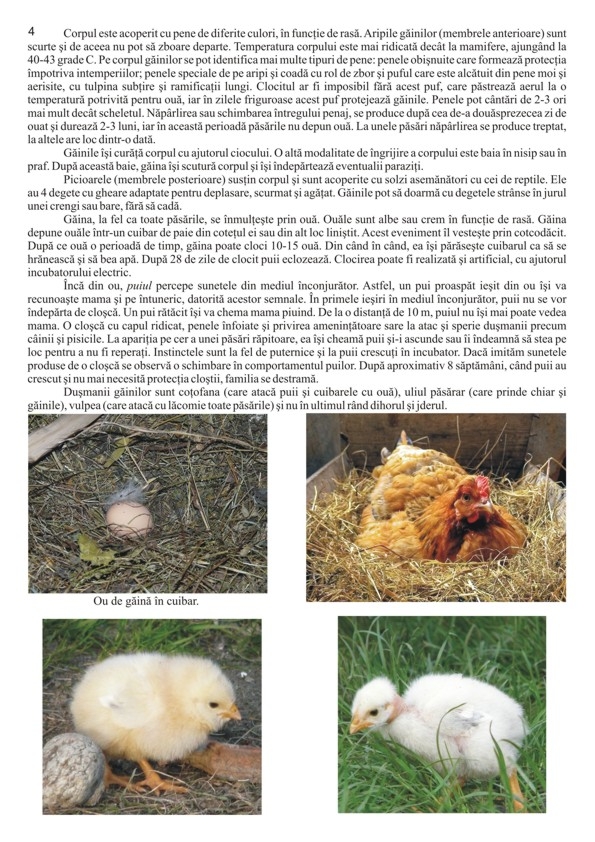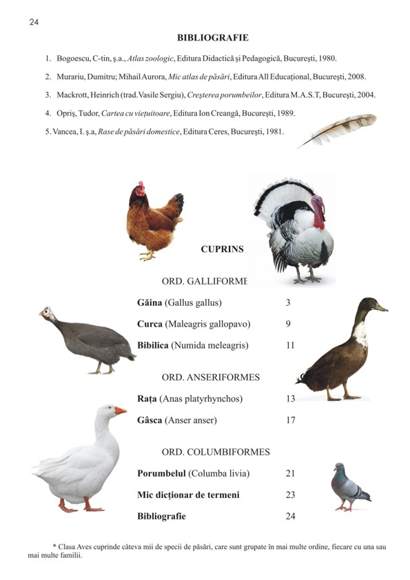 Această lucrare a fost realizată pentru a veni în sprijinul copiilor şi al cadrelor didactice, începând de la învăţământul preprimar şi până la cel gimnazial. Parcurgând această carte, bogat ilustrată cu fotografii, copiii vor cunoaşte denumirea corectă a mai multor păsări domestice, strămoşul lor, cum arată şi cum se comportă, care le este familia, cu ce se hrănesc, cum pot fi îngrijite şi ce importanţă au pentru om. FORMAT: 21 X 29,7 cm, 24 pag. color cu fotografii, hârtie lucioasă.